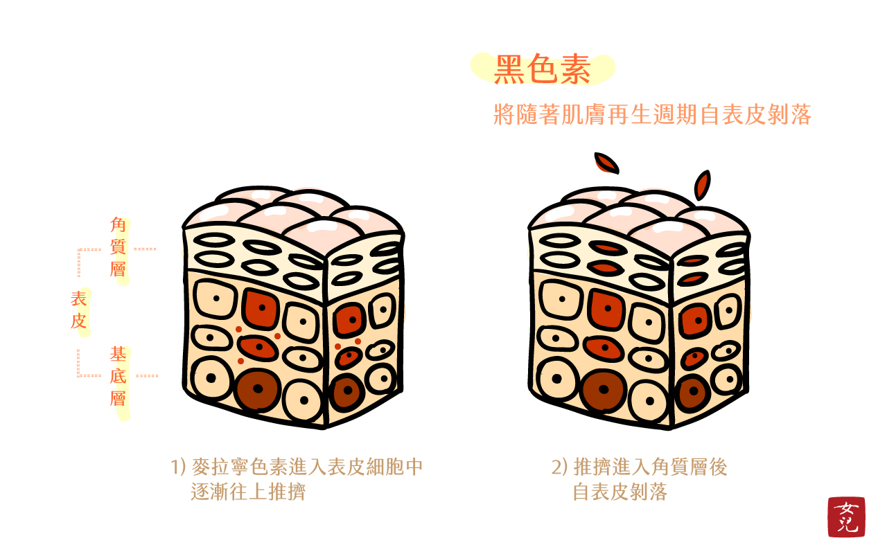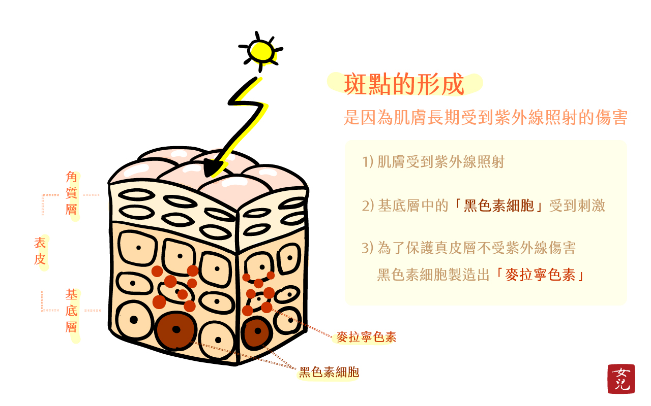 一般的狀況下,麥拉寧色素會隨著肌膚再生周期的更新,自表皮剝落,不會在肌膚形成斑點。但隨著年齡增長,肌膚再生周期減緩,麥拉寧色素便容易沈澱在基底層下方的真皮層,形成斑點。